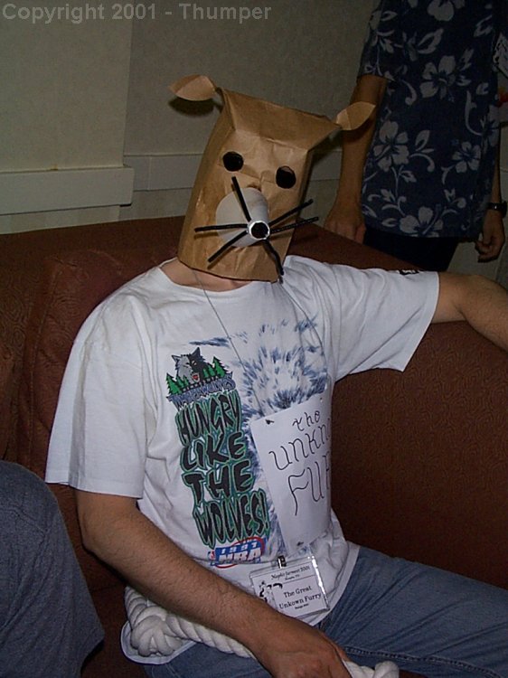The Unknown Furry At first I wasn't going to go to Mephit Furmeet. I really needed a break. Then I decided that it might be fun to go in disguise. Originally I thought to just dress casually and wear sunglasses and try to appear nondescript, but that's been done and seemed so terribly boring. I happened to be pondering the problem one day while watching the Funday Pawpet Show. In my hand was a paper bag that had contained my dinner for the evening and I was playing with it while watching the show, idly thinking what a silly puppet I could make from it. That's when it hit me. I grabbed a pencil and a pair of scissors and ran into the next room with the bag, which I promptly pulled over my head. It was much too high and needed to be trimmed down so that it fit snugly on the crown of my head and came down just to my neck. With the pencil I traced around my glasses-rims and cut two eyeholes. Next came little leaf-shaped ears cut from the trimmed portion, which were stapled to the top. Then there was a piece of pasteboard rolled into a cone that was taped below the eyeholes. Lastly, three black pipecleaners poked through the narrow end of the cone for whiskers, and The Unknown Furry was born. With another piece of pasteboard I fashioned a sign bearing that name and hung it around my neck. The overall image that presented itself in the mirror when I stopped to admire my handiwork was ludicrous. Perfect! Secrecy was of the utmost importance. I told only Bennie, who believed that people would still recognize me from my gait and posture. I spent a month practicing what my mom called the "South Philly Stroll," a slouching, strutting sort of locomotion made popular by the street toughs in that area. It made my back ache, but after all, Lon Chaney nearly crippled himself to play Quasimodo. The show must go on. As a last-minute concern, I added a pair of clip-on sunglasses beneath, giving The Unknown Furry big black eyes. This way nobody could peer into the eyeholes and deduce my identity. As a very last- minute idea I went to the pet store and bought for $1.49 from the bargain bin a dog toy in the form of a long knotted rope. Slipping it under my belt in the back, I now had a tail. My original plan to make my appearance during the Pawpet Show at Mephit Furmeet on Friday got ruined by another Storm That Wasn't. It was the second time that a trip south had gone awry because of airlines cancelling flights in preparation for a forecast storm that never really materialized. I had to fly in on Saturday morning, which actually worked out for the better. At 8 AM, it was highly unlikely that any furryfolk would see me at the airport and spread the word. I collected my luggage and boarded a hotel shuttle. In the van were the driver, a United Airlines pilot, and myself. "I hope you gentlemen will not be alarmed," I said as we pulled away from the curb, "if I put a paper bag over my head." "Not me," said the driver. "I won't," said the pilot. Now, I did explain to them that I was attending a "Costumer's convention" and that this was my costume. The gentlemen were amused and promised not to look askance as we exited the vehicle. They played their parts well, and at 8:25 AM on September 1, 2001, The Unknown Furry climbed out of the van, gathered up his bags, and South Philly Strolled into the hotel. He immediately started to attract attention. Even among all the fursuits and tails and ears, people were stopping and gawking. Many of them were laughing and proclaiming what a fantastic idea this was. A few tried to speak to him, but all he did was gesture and pantomime, conveying his thoughts with a head tilt or a tug at his whiskery paper muzzle. There was no trouble checking into the hotel room. The Unknown Furry pranced up to the counter, gave a cheerful wave, and then presented a series of index cards to the clerk: "Hello!" "Ssssshhhhh!" "I am travelling incognito. Please tell no one who I am." "Confirmation #905XXX." This one along with a credit card, after a careful look round to make sure no prying eyes were, well, prying. The first big challenge was con registration. Identification was required! The Unknown Furry solved this problem by strolling up to chairman Kodian, taking him by the elbow and dragging him to a safe distance, and then surreptitiously showing him a driver's license. Kodian's eyes looked like they were going to fall out of their sockets for a moment, and then he smirked and gave a thumbs-up. "Come back in a little bit," he said. I happened upon Zim, an online friend that I'd been meaning to meet, and dragged him off to my hotel room, where I unmasked for the introduction. He is a fine young chap and we wound up hanging out together now and again. I left him to look at some things I'd brought along to show off while The Unknown Furry masked up and went downstairs to get his badge. Kodian had entered the data himself in the computer, listing the name simply as "Sam" and the address as "PA." He had made up a badge that read THE GREAT UNKOWN FURRY! Nobody noticed until the next day that the third word was indeed "unkown." The Unknown Furry spent a leisurely day visiting with the folks who were gathered around and wandering the halls. He stopped in the dealers' room and made an enormous impression. One artist insisted that he pose for a drawing. I don't know how many pictures got snapped. He took it all in stride, though, rubbing his eyes and pretending to be blinded after every flash bulb went off. Bill Holbrook was amused when the Unknown Furry stopped by his table to bow and grovel before his genius. The charity auction was Saturday afternoon and the Unknown Furry happily attended. He wanted to buy a number of items but did not have much money, and the fact that he could talk presented something of a problem. He solved this by making up a series of index cards with fixed values on them, $5, $10, $15, $20, $25, $30. On hotly-contested items he would frantically shuffle through his cards, holdin